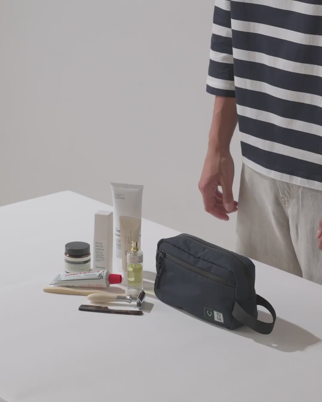 Made from durable 100% recycled ripstop fabric, the wide-opening main compartment offers easy access to essentials, while the internal water-repellent lining is simple to wipe clean in case of spillages. Inside, a full-length mesh pocket and two smaller compartments allows you to neatly separate toiletries, makeup, or grooming essentials. A front pocket keeps must-haves within easy reach, and the handy side strap doubles as a carry or hanging loop.