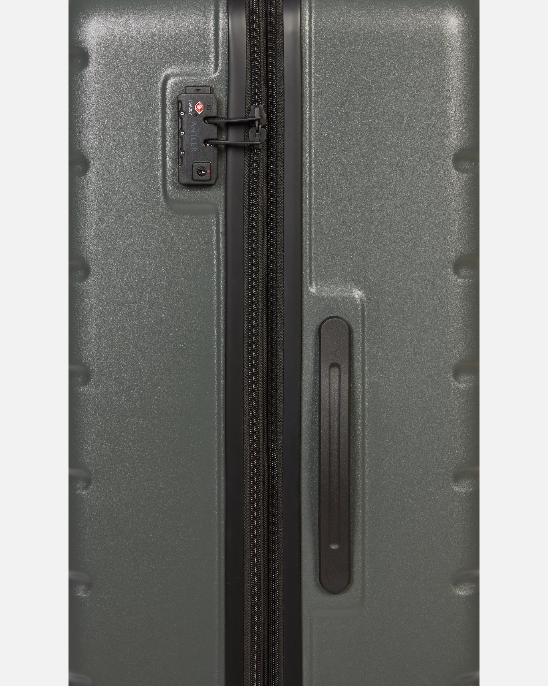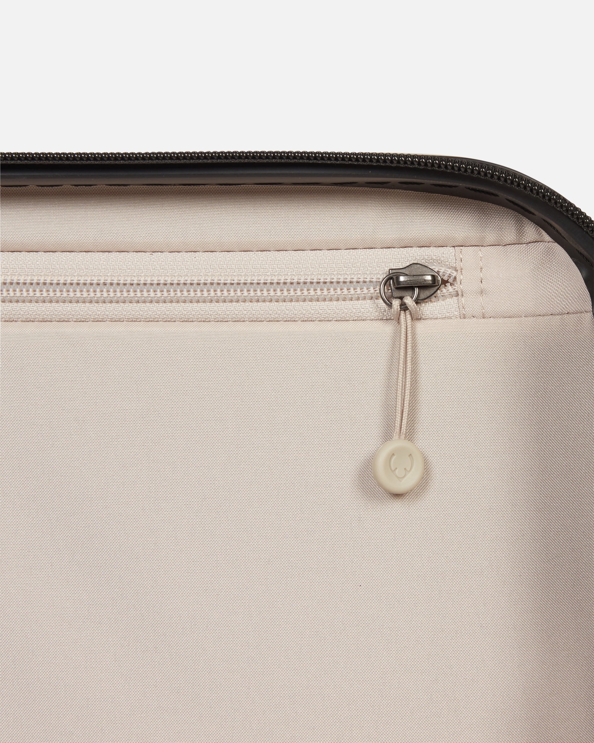 Tailored for minimalist travel, Logo includes all the essentials for a fuss-free experience. Its expandable design allows for versatile packing, while the fully recycled interior lining offers organisation through three zipped compartments. Branded compression packing straps keep your belongings secure, and a discreet side pocket keeps valuables tucked away.
