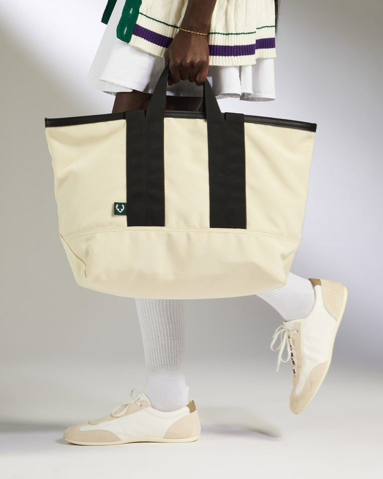 Whether you’re browsing the local market or spending a competitive day on the tennis courts, this bag adapts with ease. Flip from classic cream to all-black in seconds, and choose between short grab handles or a longer shoulder strap depending on what the day brings. Made from durable fabric, a structured base keeps its shape, while the internal hanging pocket provides a handy place to keep personal items close.
